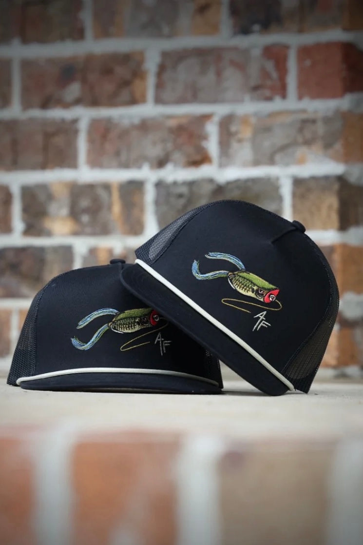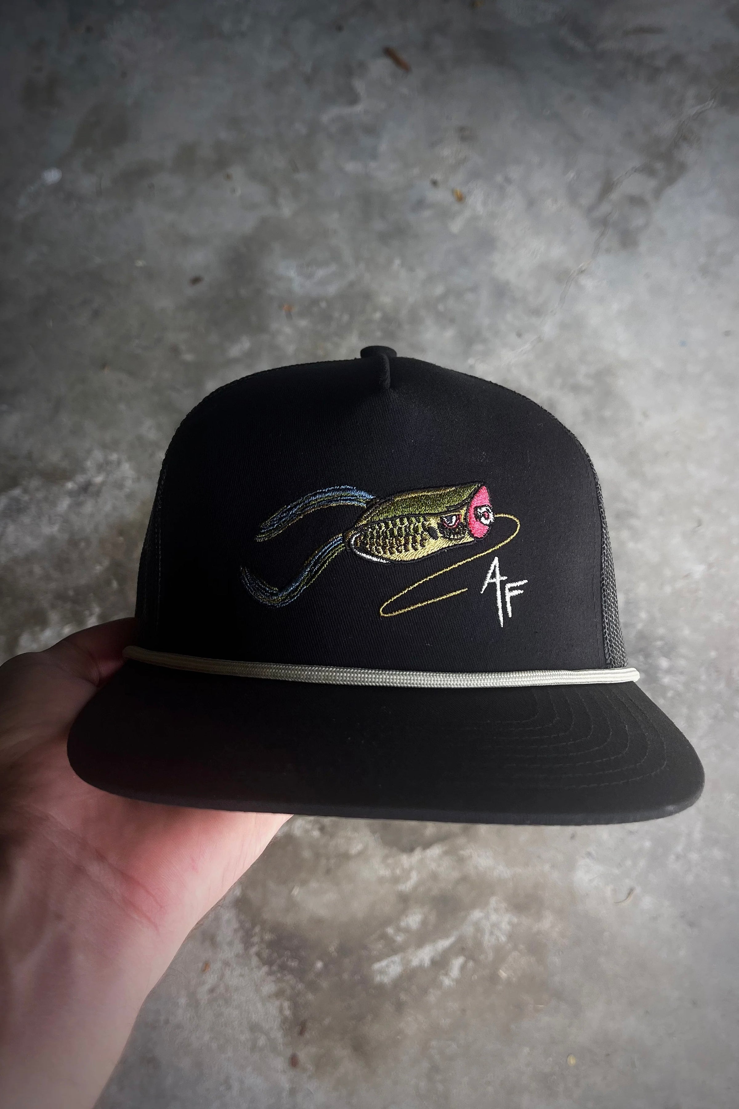 Our Frog - All Black Rope from American Fetcher is a custom 5-panel trucker hat designed for everyone. This hat comes with an adjustable snapback, ensuring a comfortable fit. As a pioneer in detailed hat designs, American Fetcher has brought the outdoors to you with this hat.