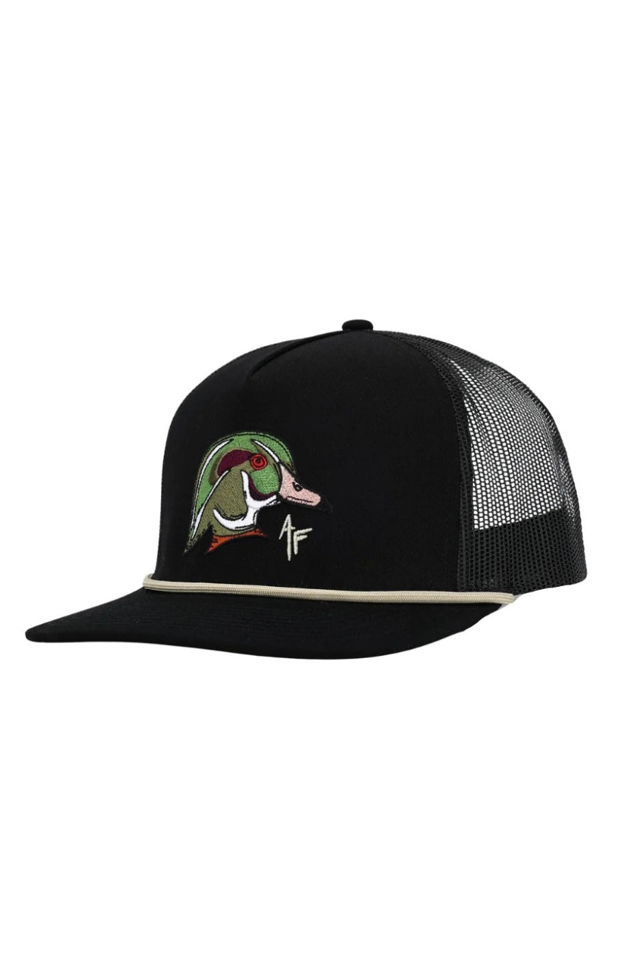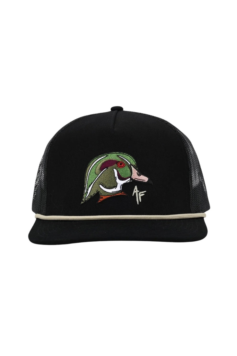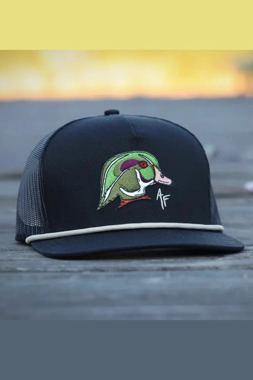 Our Wood Duck Rope Hat is a custom snapback from American Fetcher, a brand known for its detailed designs and love for the outdoors. This higher profile hat (sits taller on the noggin).