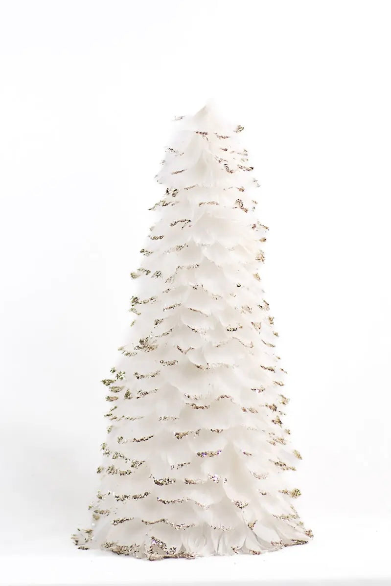 Ethereal and elegant, our Winter Feather Tree brings a soft, snowy glow to your holiday décor. Standing 15" tall, this stunning piece features layers of delicate white feathers dusted with shimmering gold accents, creating a look that’s both graceful and glamorous. Perfect for adding height and texture to mantels, entryways, or tabletop displays — it’s a showstopper that captures the magic of a sparkling winter wonderland.
