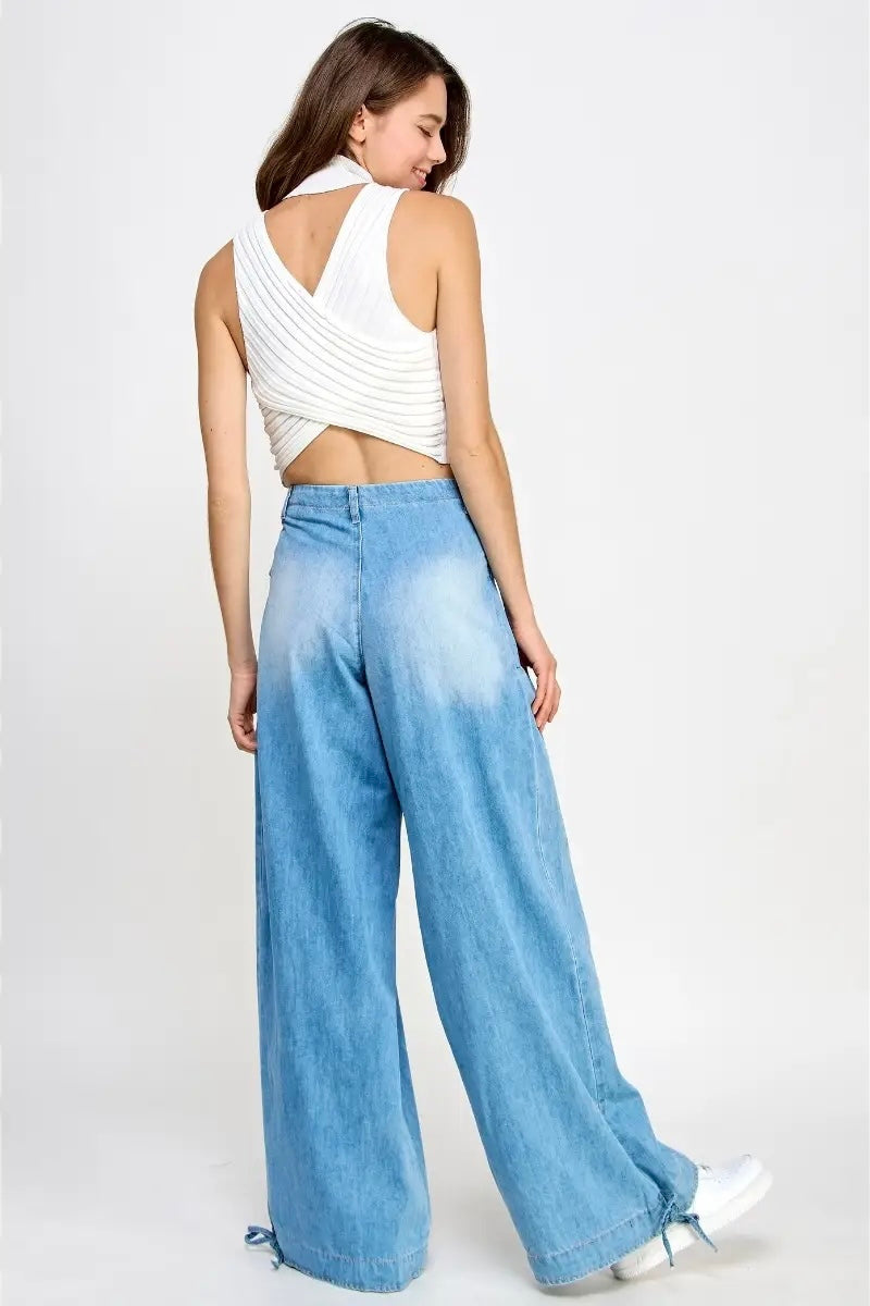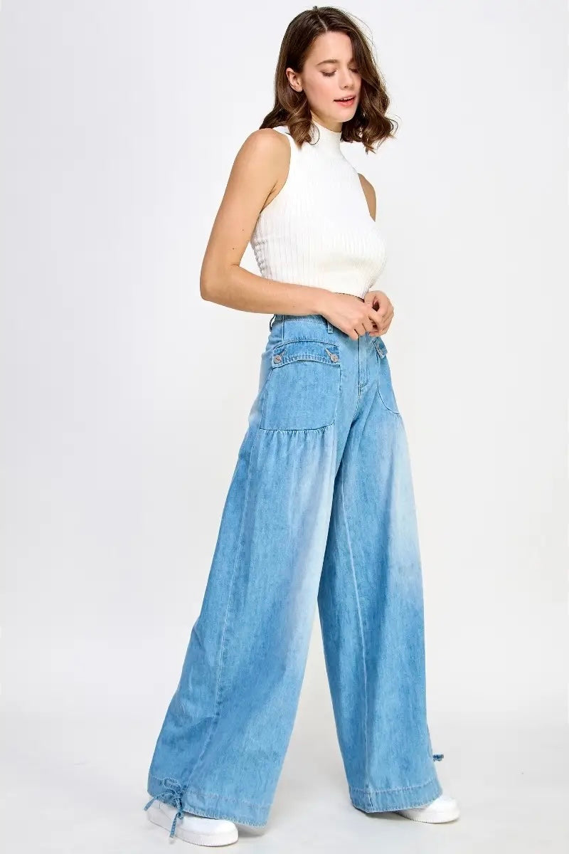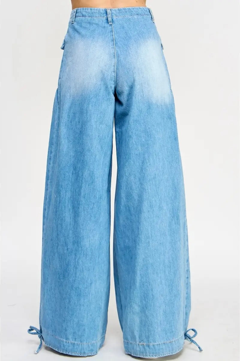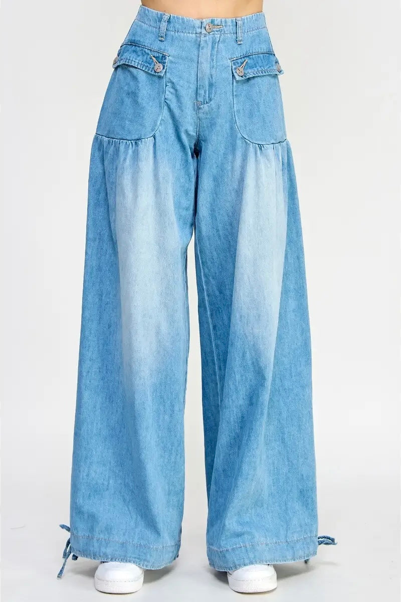 Your new go-to denim with effortless edge. These medium wash Wide Leg Relaxed Jeans feature a laid-back silhouette with standout details that make them anything but basic. Designed with a drop waistline, cargo-style button pockets, and adjustable ankle drawstrings, they strike the perfect balance between comfort and cool.