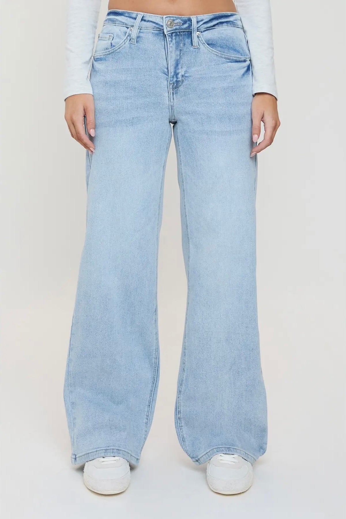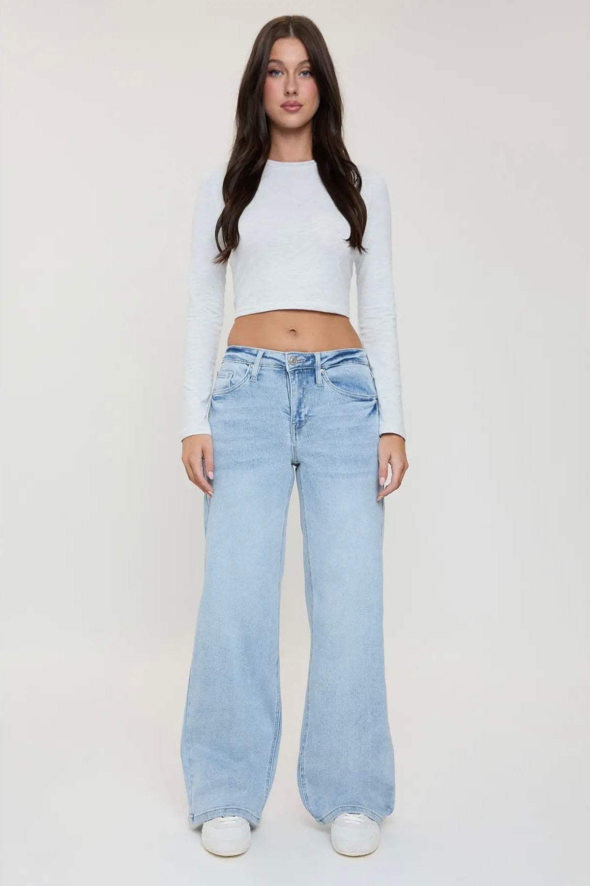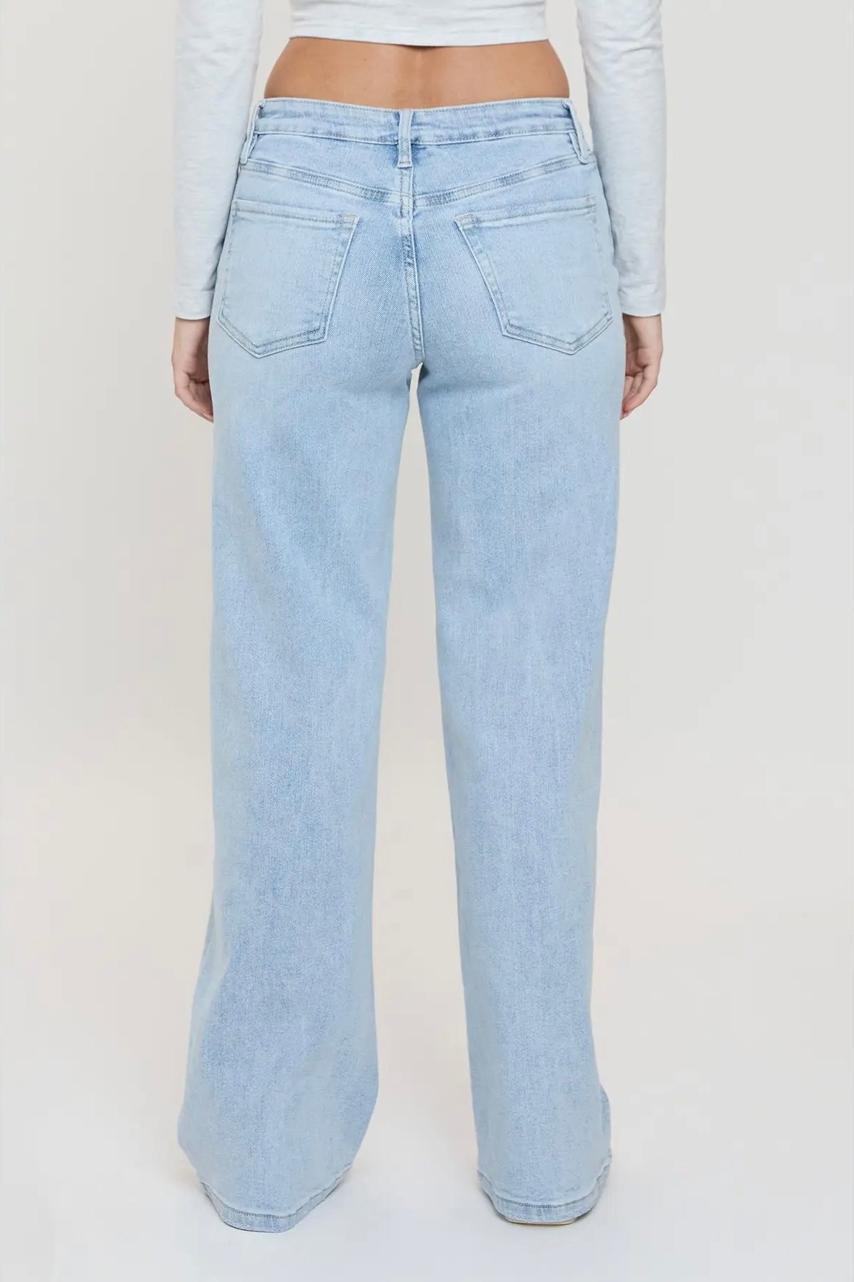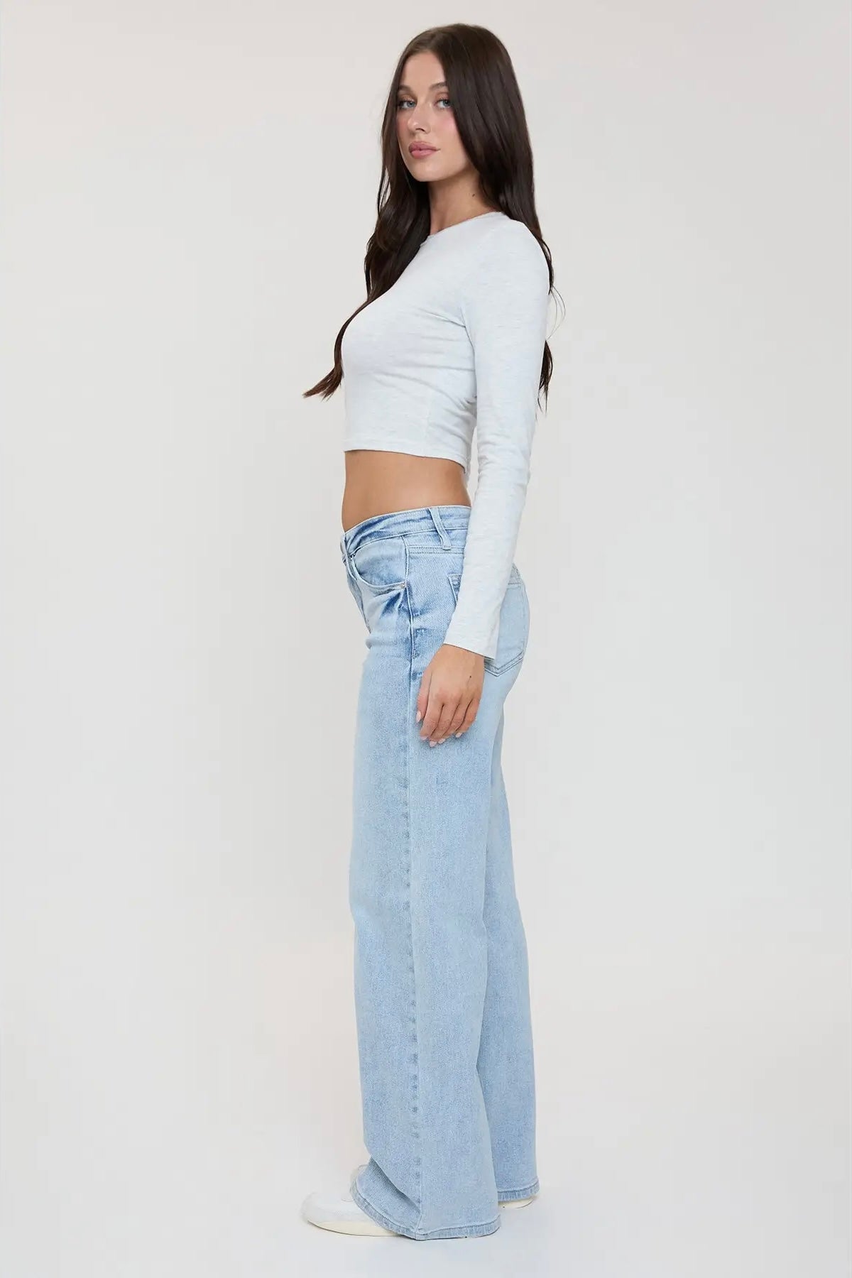 The high-rise waist flatters and supports, while the wide leg adds a modern, relaxed vibe that moves effortlessly from day to night. Finished with classic five-pocket styling, a button and zipper fly, and belt loops, these jeans are the perfect blend of comfort, versatility, and on-trend style.
