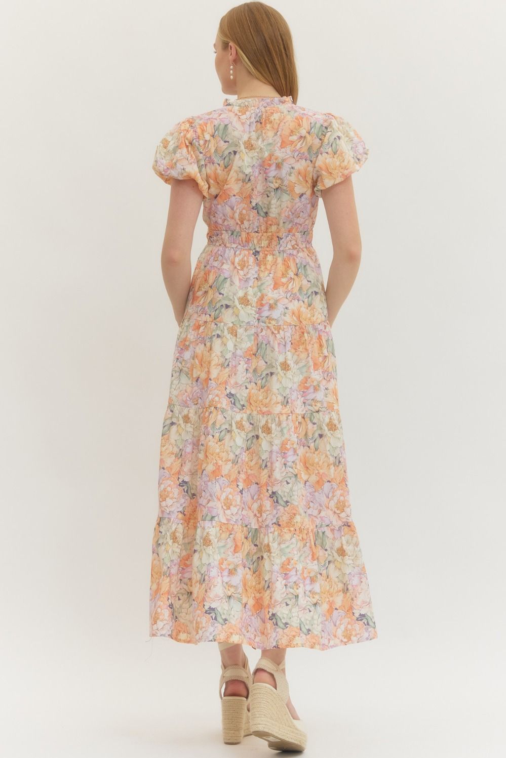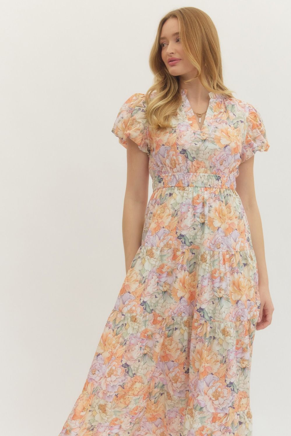 The flattering V-neckline pairs perfectly with short puff sleeves for a touch of feminine structure, while the smocked waistband defines your shape comfortably and creates a graceful, flowy fit. A tiered skirt adds movement and dimension, making this dress just as perfect for brunch dates as it is for weddings, showers, and special events.
