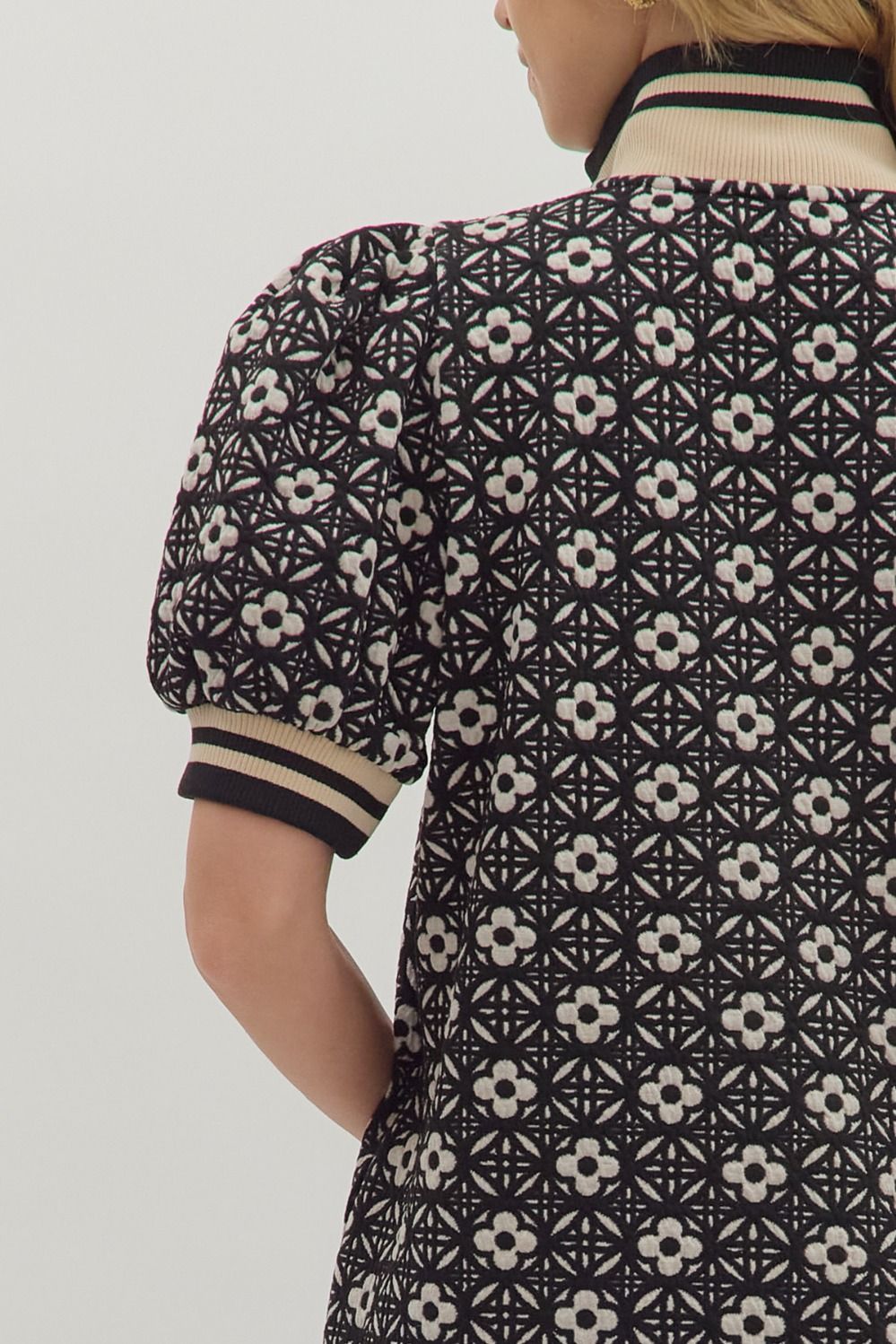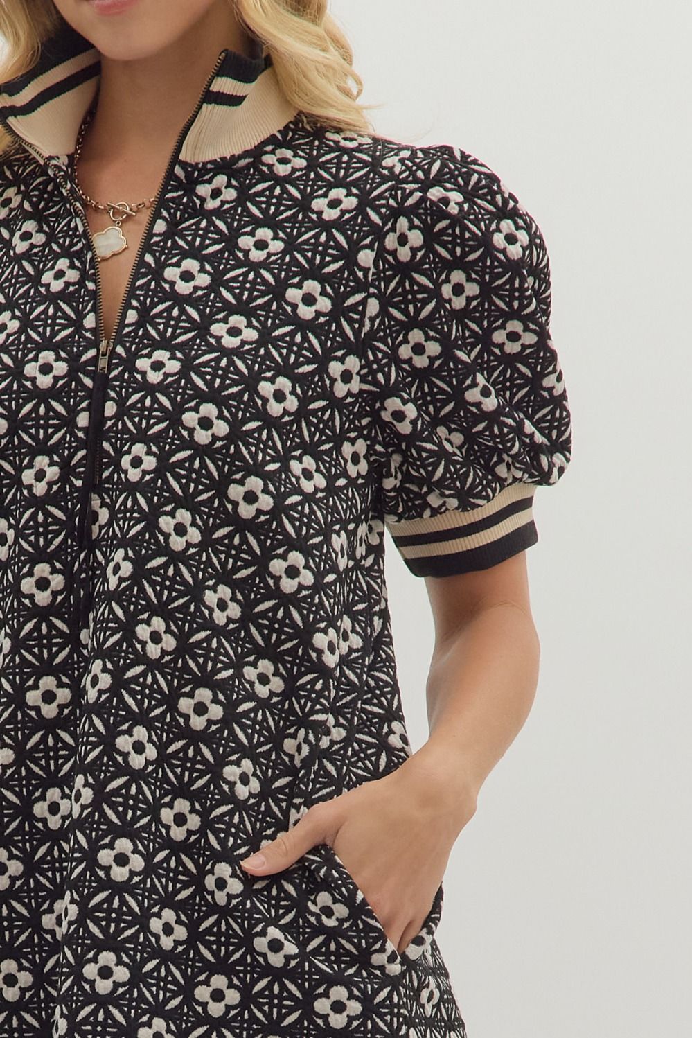 Elevate your everyday style with the Maribel Dress — a chic blend of sporty details and feminine flair. Designed with a textured floral pattern in classic black and cream, this dress stands out with its puff sleeves, striped collar and cuffs, and flattering zip-front neckline. The easy, shift-style silhouette makes it perfect for dressing up with heels or keeping it casual with sneakers.