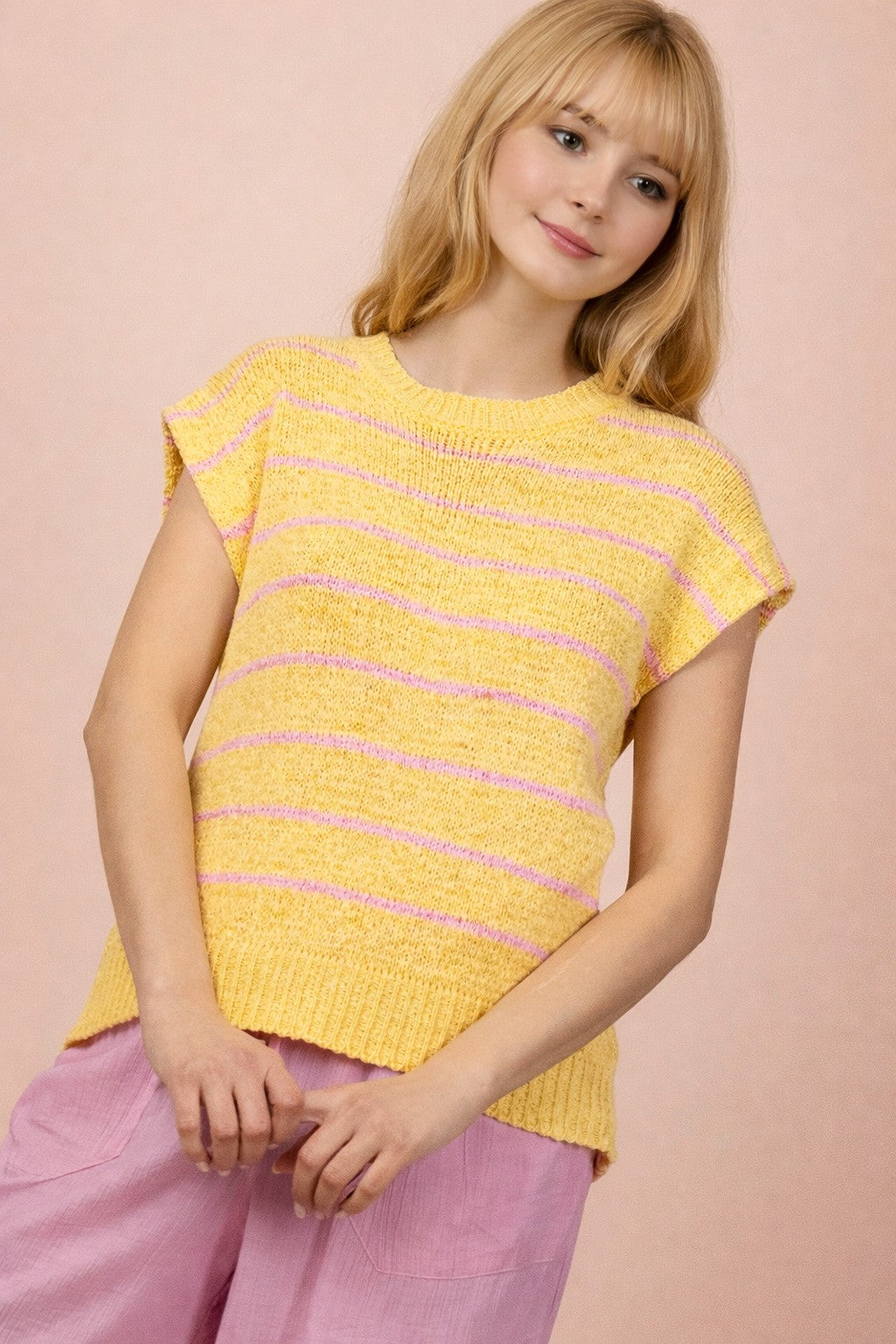 Bright, playful, and effortlessly charming, thoure Goldie Striped Knit Top brings a cheerful pop of color to your everyday wardrobe. This lightweight knit features soft stripes, a classic round neckline, and easy cap sleeves for a relaxed, flattering silhouette. Finished with a ribbed hem for added structure, it pairs beautifully with denim, shorts, or layered looks as the seasons change.