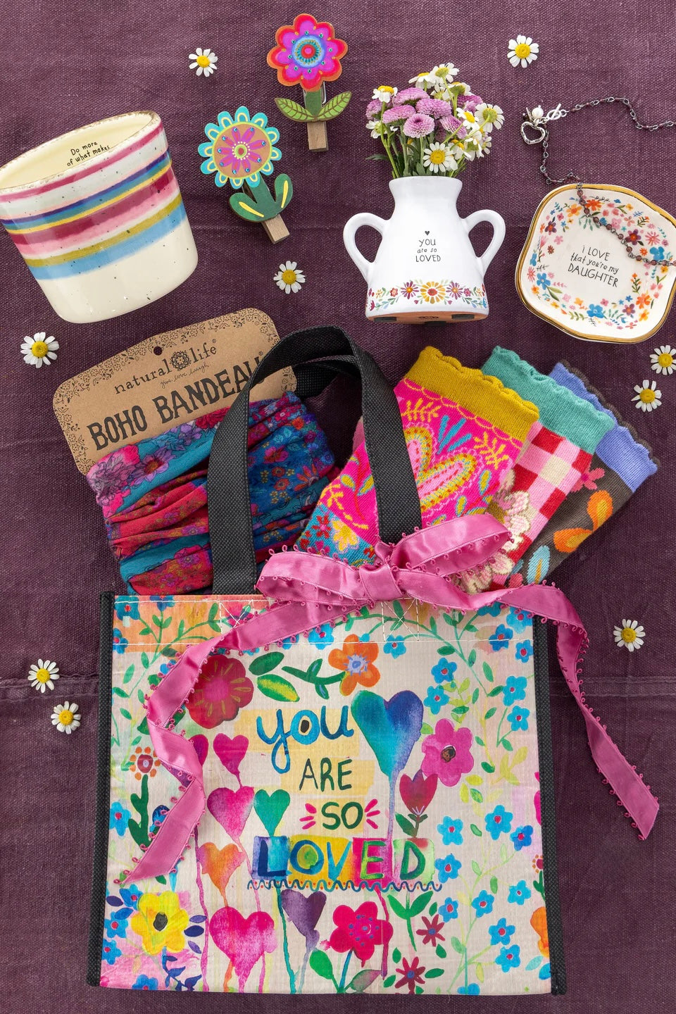 These bags are our favorite for so many reasons… they're made with recycled water bottles and never get dog-eared so you really can use them forever! They are perfect for filling with treasures for gifting… like your favorite boho bandeau, wine tumbler or accessory! It’s so fun to personalize and gift a Natural Life Happy Bag™!
