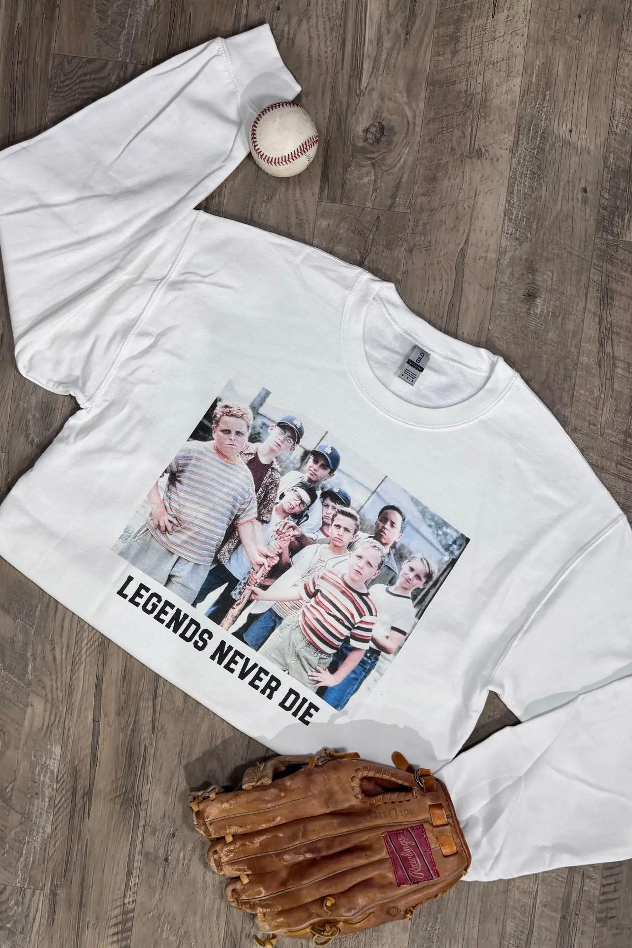 A total throwback for movie lovers and vintage tee collectors alike. This cozy sweatshirt features the iconic cast of The Sandlot with the phrase “Legends Never Die,” celebrating one of the most beloved films of all time. Soft, comfy, and effortlessly cool, it’s the kind of piece you’ll reach for on repeat—perfect for casual days, game nights, or layering year-round.